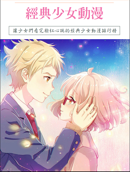 我已經看了有12 年的動漫,涉略了許多種類型,有校園、戀愛、冒險、科幻…等等類型的動漫幾乎都看過,可是心裡還是懷有少女情懷,對於少女戀愛動漫非常地憧憬,所以整理了目前看過,覺得自己最喜歡的前五名經典少女動漫,希望大家會喜歡。