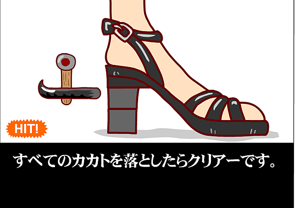 要幫忙各種職業的人敲掉鞋跟,像是學生妹、上班族還有天狗,每次最緊張的就是不小心把鞋跟敲歪的時候,有時候還要看準時機把鞋跟敲回來,真的需要動一點頭腦呢!如果敲到讓人跌倒或是敲到腳,還要賠償醫藥費,錢真的很難賺欸!加上時間限制,要在時間限制內敲平高跟鞋,不然也是會扣掉一次機會,總共有三次機會,所以既要在時間內完成敲鞋跟還不能打歪,真的需要多多練習。