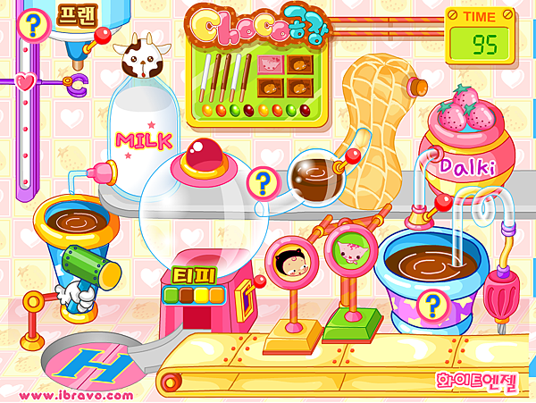 阿Sue系列有非常多有趣的遊戲都很經典,介紹這個跟前面甜點工廠差不多的小遊戲,真的很喜歡這種有時間限制的挑戰遊戲,這次是製作巧克力棒、巧克力豆和巧克力片,時間都要拿捏得很好,最難的我覺得是製作巧克力片,要配合印章上升下降的速度去擠巧克力,比較需要花時間,其他都非常簡單,最後完成的畫面,是阿Sue拿著一籃巧克力開心地說「I love You」,多多練習一定會成功的!