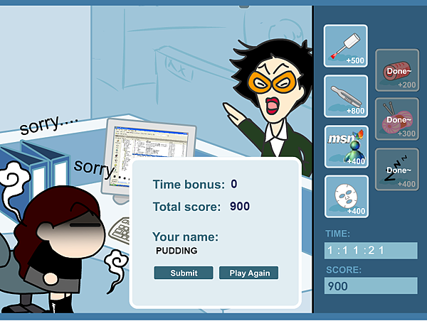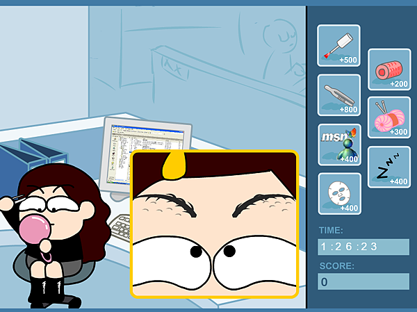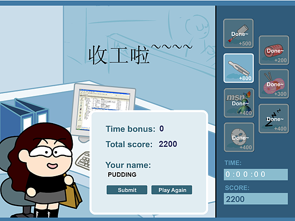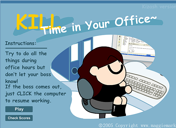 美吉系列也是非常有名的Flash必玩小遊戲,像是海產店、壽司店以及美容院,只要在玩小遊戲就會玩到,其實本來想要介紹美吉美容院,可是好像遊戲在維修不能玩,就沒有介紹了。上班摸魚也是很有趣的遊戲,在上班卻要趁主管不注意的時候偷懶,像是擦指甲油、敷面膜、捲髮和傳訊息......等,其中覺得最困難的一項就是拔眉毛上的雜毛,很多細毛不好點擊又要一邊注意主管來了沒,即時反應要很快,其他的項目其實都能快速完成,並沒有什麼太大問題,美吉的表情和動作,真的很可愛,在上班的苦悶時光,卻能輕鬆自在的摸魚,也是蠻厲害的😆。