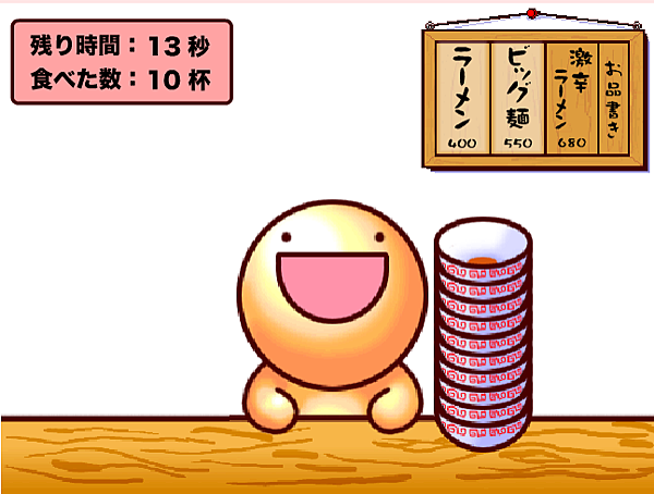 幾乎小時候都玩過吃拉麵的遊戲吧!還會跟別人比看誰吃最多碗拉麵,偶爾旁邊會隨機出現巨大拉麵或是辛辣拉麵,都可以額外增加碗的數量,巨大拉麵是+3碗,辛辣拉麵是+5碗,每次按完滑鼠手都會超痠的😂,真的是大胃王呢,可以在三十秒吃那麼多碗,曾經最高紀錄是42碗,當然是在遊戲中才能夠這麼厲害囉!
